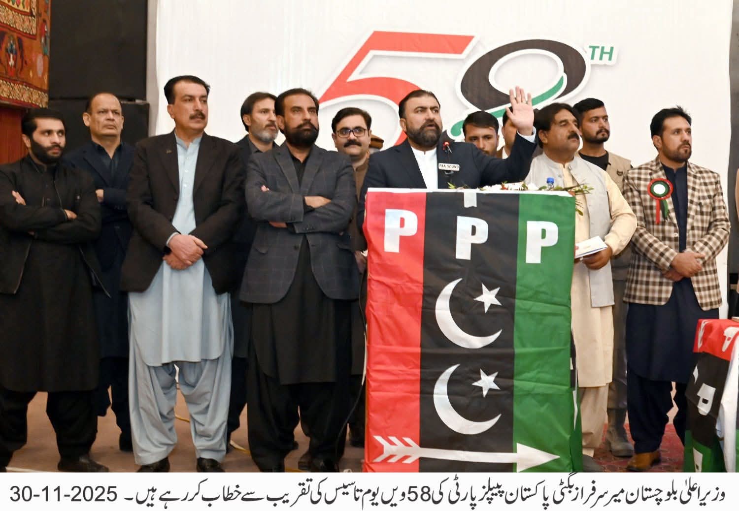 پاکستان پیپلز پارٹی کے 58ویں یومِ تاسیس کی تقریب میں وزیر اعلیٰ بلوچستان میر سرفراز بگٹی نے اپنے خطاب میں اس بات پر زور دیا