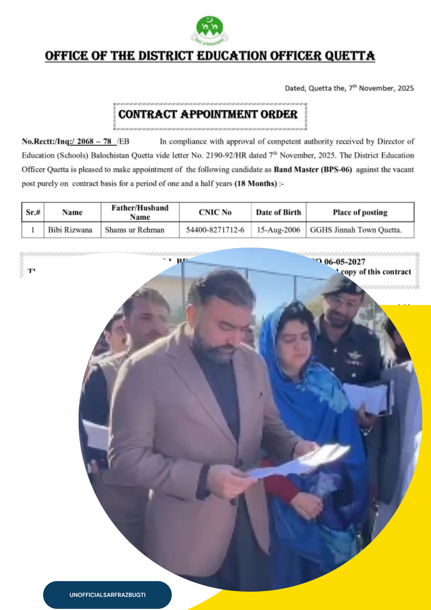 کوئٹہ: گورنمنٹ گرلز ہائی اسکول جناح ٹاؤن کوئٹہ کی فارغ التحصیل ہونہار طالبہ رضوانہ بی بی کو بینڈ ماسٹر کے…