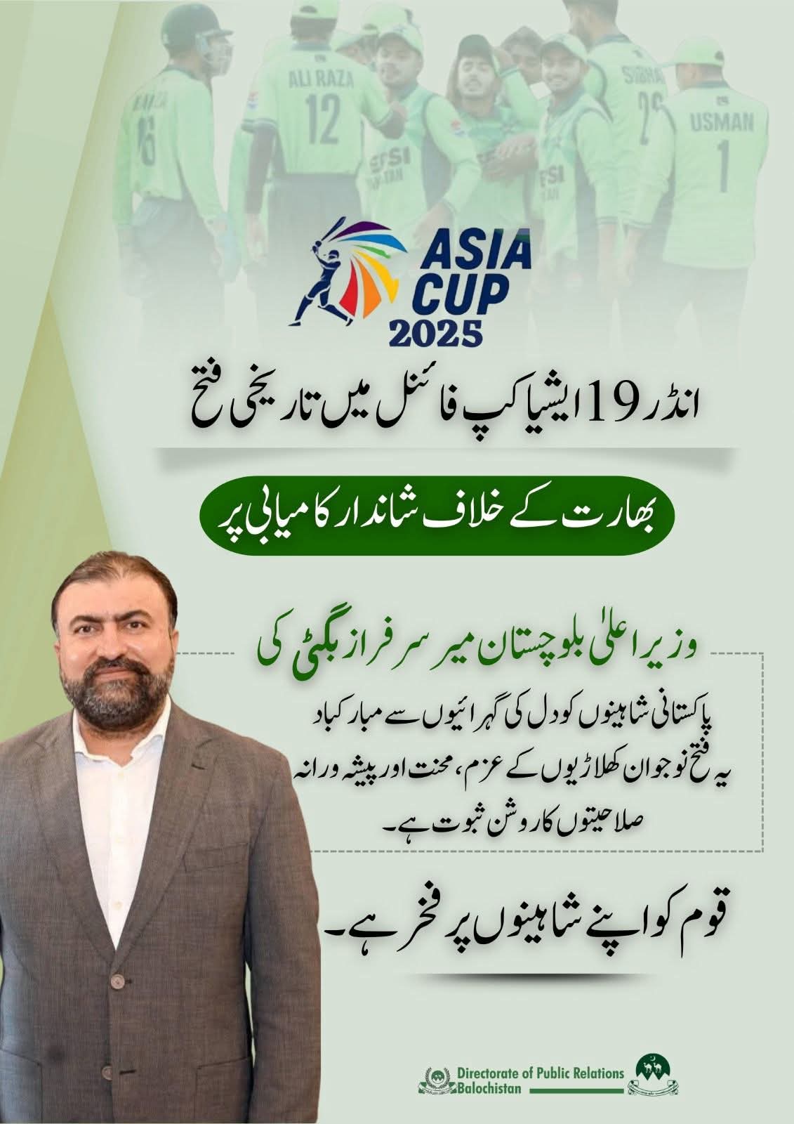 انڈر 19 ایشیا کپ میں تاریخی فتح، وزیراعلیٰ بلوچستان کی پاکستانی شاہینوں کو مبارکباد