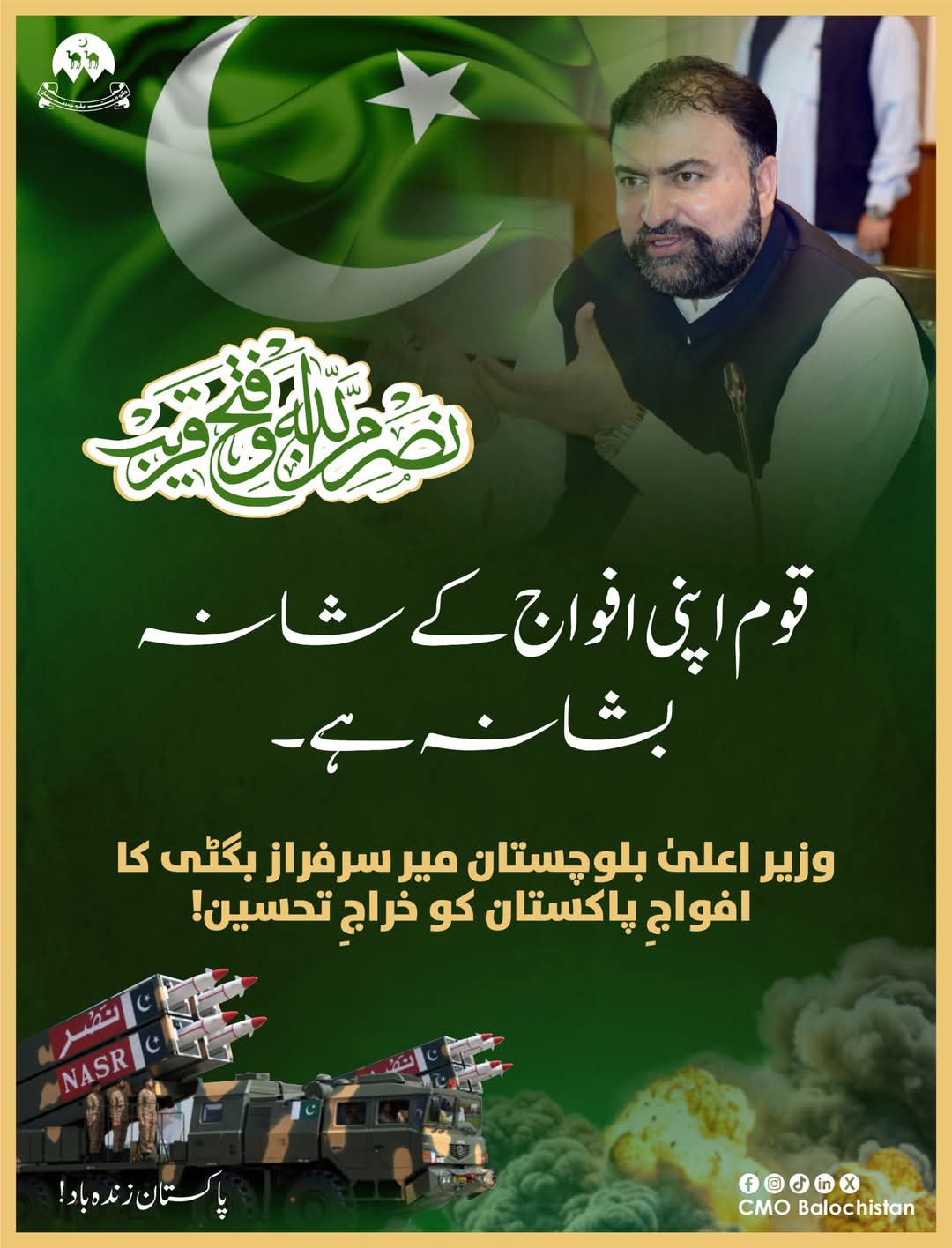 وزیر اعلیٰ بلوچستان میر سرفراز بگٹی نے بھارتی جارحیت کے خلاف پاک فوج اور فضائیہ کے دندان شکن جواب پر…