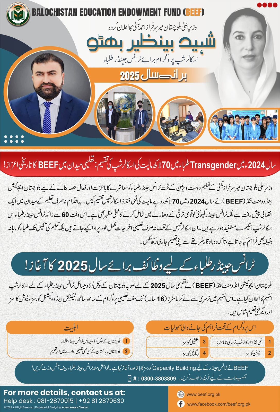 وزیر اعلیٰ بلوچستان میر سرفراز احمد بگٹی کی ہدایت پر بلوچستان ایجوکیشنل انڈومنٹ فنڈ (BEEF) نے ٹرانسجینڈر طلبہ کے لیے…