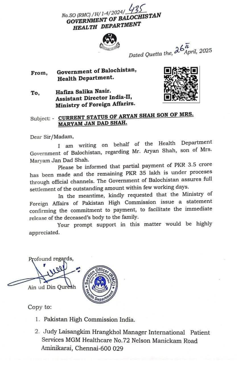 وزیر اعلیٰ بلوچستان میر سرفراز بگٹی نے انڈیا میں زیر علاج وفات پاجانے والے بچے آریان کی والدہ کی اپیل…