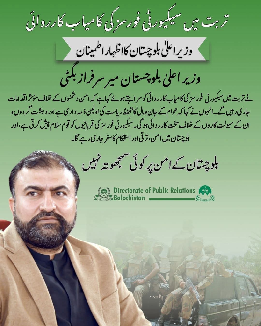 وزیراعلیٰ بلوچستان میر سرفراز بگٹی نے تربت میں سیکیورٹی فورسز کی کامیاب کارروائی پر اطمینان کا اظہار کرتے ہوئے کہا…