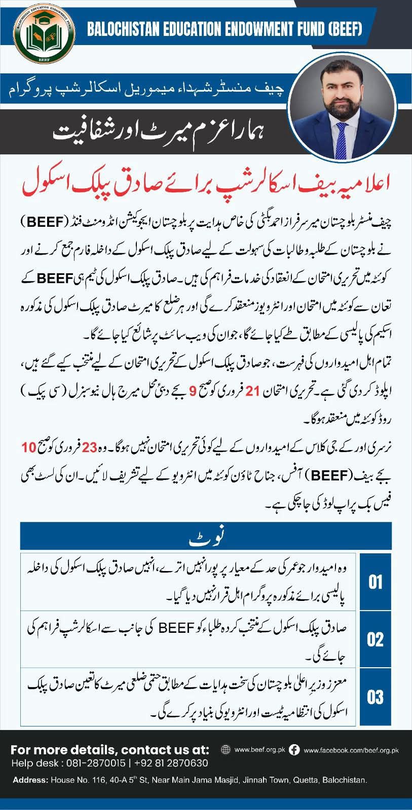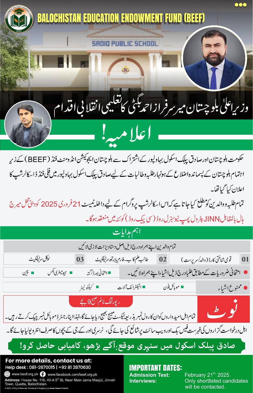 حکومت بلوچستان اور صادق پبلک اسکول بہاولپور کے اشتراک سے بلوچستان ایجوکیشن انڈومنٹ فنڈ (بیف) کے تحت بلوچستان کے پسماندہ…