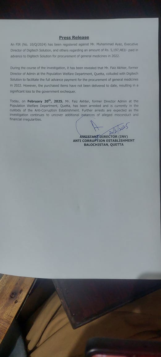 اینٹی کرپشن اسٹیبلشمنٹ نے کوئٹہ میں محکمہ پاپولیشن ویلفیئر ڈیپارٹمنٹ کے سابق ڈائریکٹر ایڈمن فیض اختر کو مبینہ کرپشن کے…
