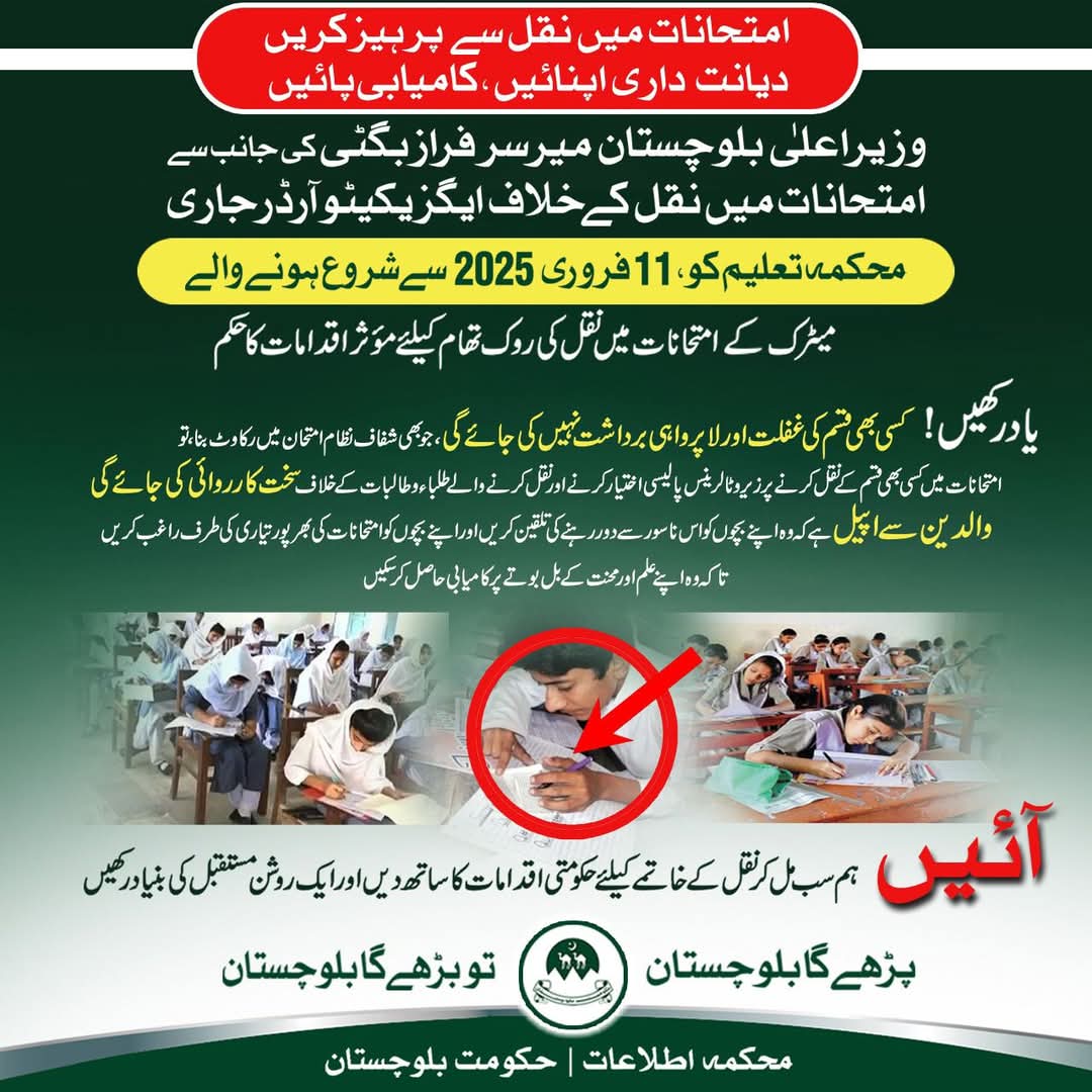 وزیر اعلیٰ بلوچستان میر سرفراز بگٹی کی ہدایت پر محکمہ تعلیم بلوچستان نے امتحانات میں نقل کے خاتمے کے لیے…