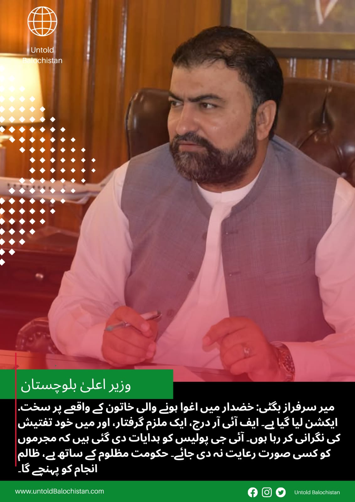 خضدار میں اغوا ہونے والی خاتون کے افسوسناک واقعے پر وزیر اعلیٰ بلوچستان میر سرفراز بگٹی نے فوری اور سخت…