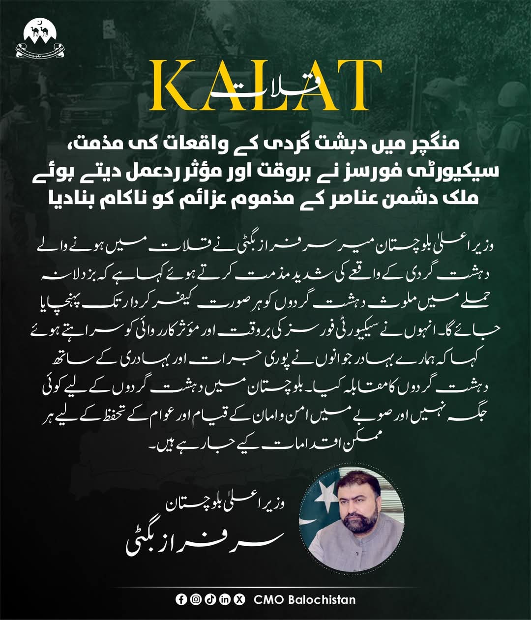 وزیر اعلیٰ بلوچستان میر سرفراز بگٹی نے قلات اور ہرنائی میں سیکیورٹی فورسز کی کامیاب کارروائیوں کو سراہتے ہوئے قلات…